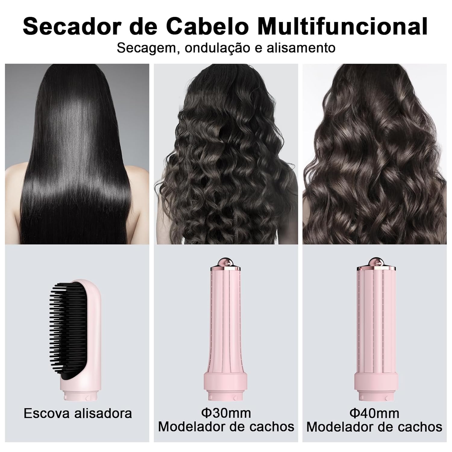 - Secador de cabelo verstil Inclui uma cabea de secador, um bico magntico, um pente alisador e dois modeladores de cachos de 19 cm de comprimento (dimetro de 40 mm e 30 mm). Oferece mltiplas funes como secar, alisar, ondular e modelar com apenas um conjunto