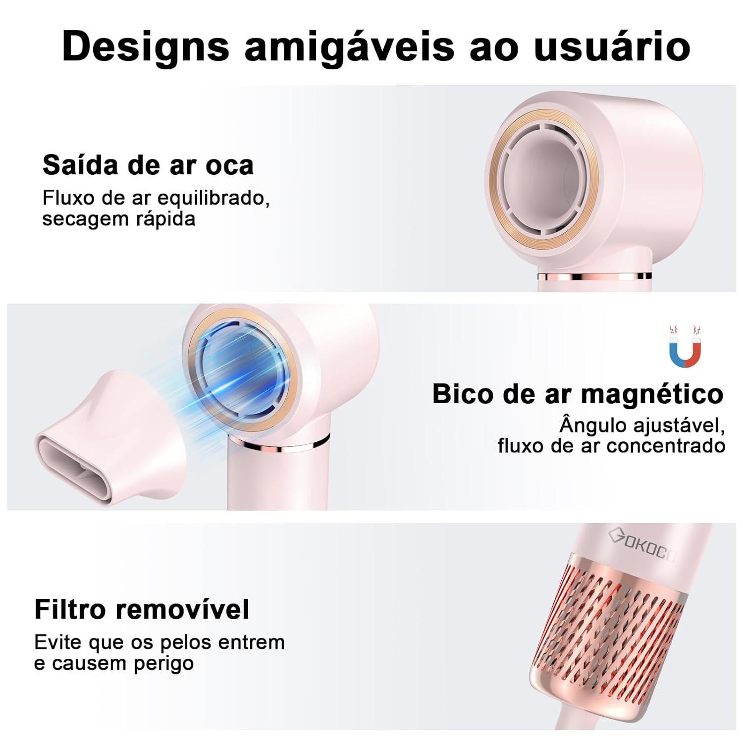 - Tamanho leve e compacto Gokoco S1 Pro pesa cerca de 400g graas ao design ergonmico, 60% mais leve do que a maioria dos secadores do mercado, garantindo uma utilizao confortvel sem qualquer dor. Seu tamanho compacto o torna ideal para viagens ou passeios, cabendo perfeitamente na sua bolsa