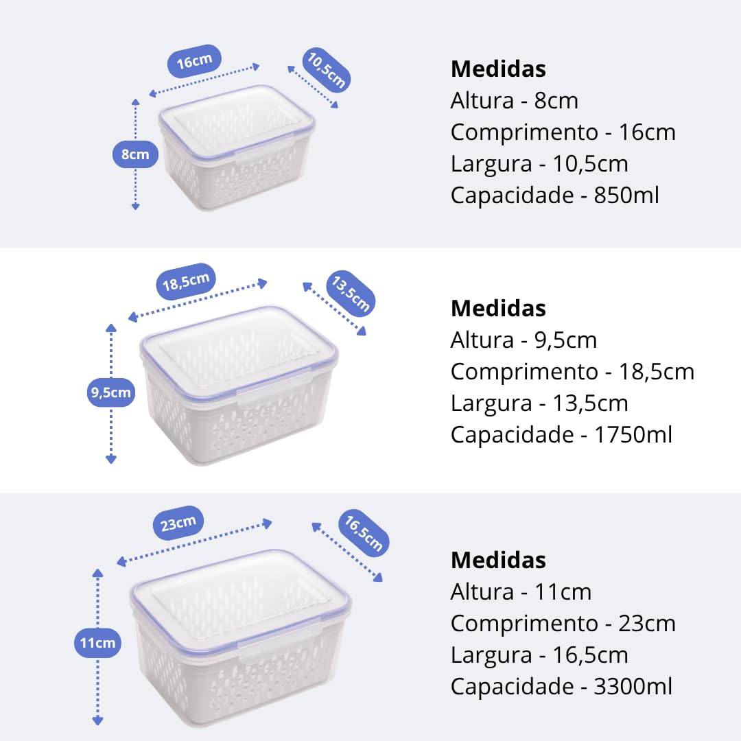 Kit 3 Potes Organizadores Herméticos para Geladeira com Cesto Escorredor, Trava nas Tampas, Sem BPA, Premium