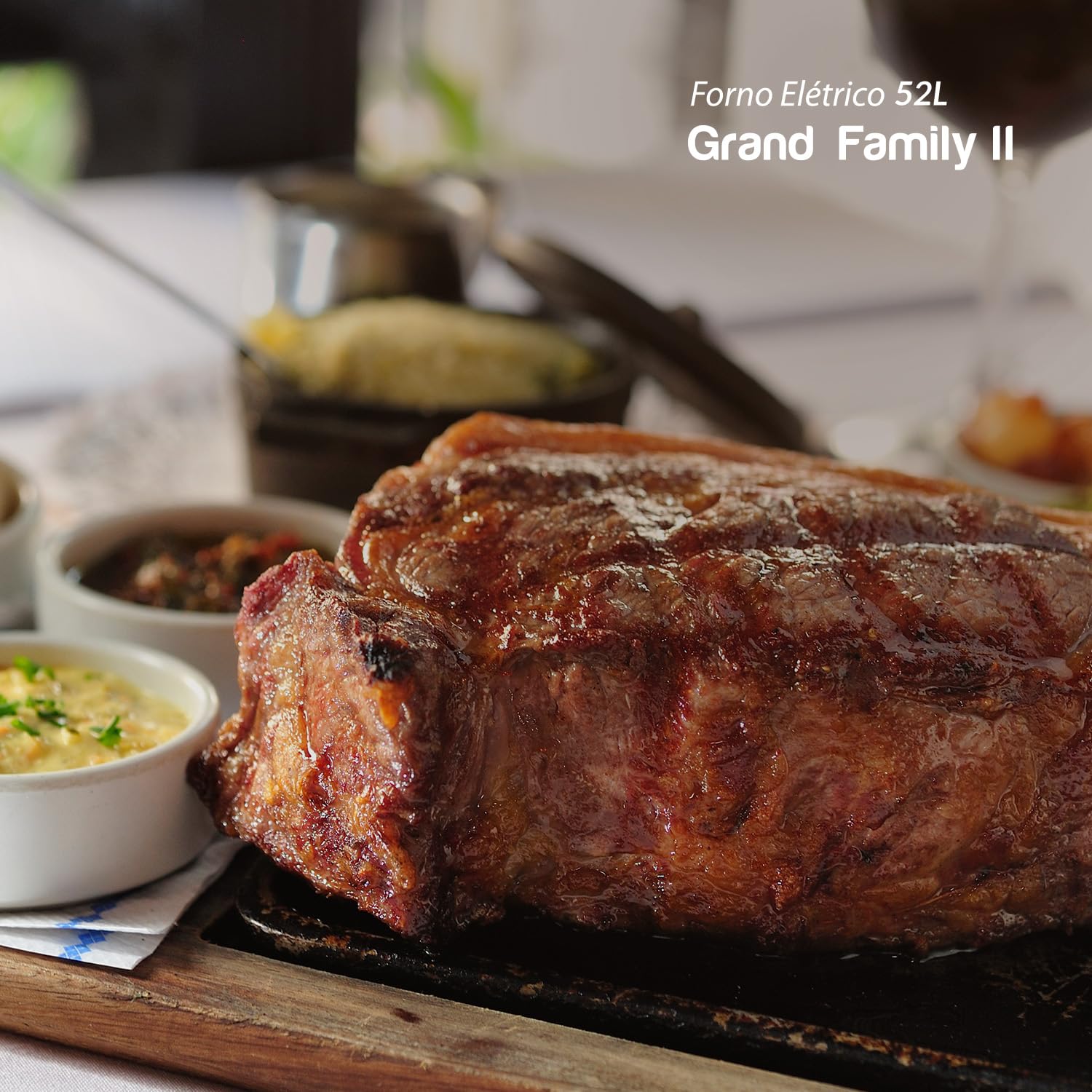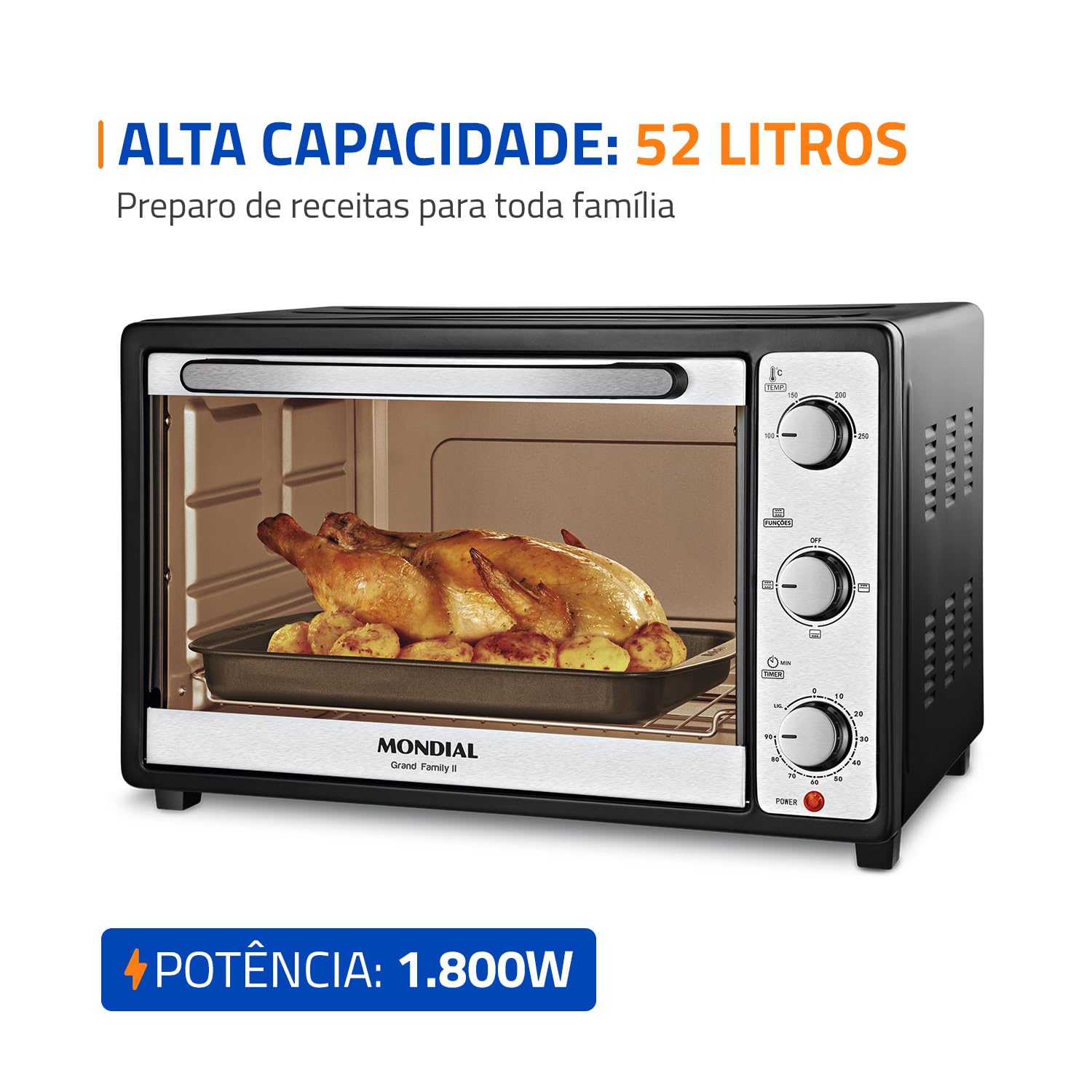 Detalhes O Forno Eltrico Mondial Grand Family II oferece mais espao e praticidade para suas receitas. Possui 52 litros de capacidade para preparar, com tranquilidade, desde pequenas pores at refeies completas para a famlia. Com 1.800W de potncia, ele aquece, assa, gratina e grelha os alimentos com eficincia. Alm disso, conta com controle de temperatura at 250C, grelha ajustvel e timer de 90 minutos com desligamento automtico para facilitar seu dia a dia na cozinha. Saiba mais sobre o FRN-52-B da Mondial Capacidade de 52 Litros Alto desempenho e timo espao! O forno eltrico da Mondial ideal para o preparo de receitas para toda a famlia. Multifunes Verstil, pode ser utilizado para aquecer, assar, tostar, gratinar, grelhar e dourar de maneira rpida e eficiente. Potncia de 1.800W Alta potncia que assegura mais agilidade e preparo eficaz de receitas variadas. Seletor de Resistncia So 3 opes de aquecimento interno para distribuir melhor o calor. Timer de 90 Minutos Programe o tempo de cada alimento com a segurana do desligamento automtico com aviso sonoro. Mais comodidade para voc fazer outras tarefas enquanto o forno trabalha. Mais Praticidade A regulagem de altura da grelha em trs nveis oferece versatilidade para um cozimento ideal, conforme o tipo de alimento. Controle de Temperatura De 100C at 250C, ajuste a intensidade da temperatura de acordo com a receita que vai preparar. Porta de Vidro Permite melhor visualizao dos alimentos durante o preparo. Puxador e Botes em Ao Inox Design moderno, com mais durabilidade e resistncia. Um Ano de Garantia Mondial A Mondial a escolha de milhes de consumidores. Mondial, a escolha inteligente!