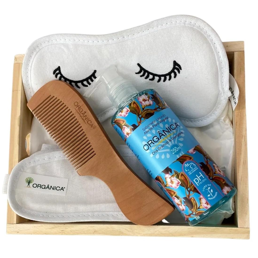 - COMPLETO Nosso kit contm 1 frasco de 250ml de sabonete lquido puro vegetal vegano, 1 faixa de cabelo em algodo puro, 1 pente de madeira e 1 mscara para para os olhos em algodo natural.
